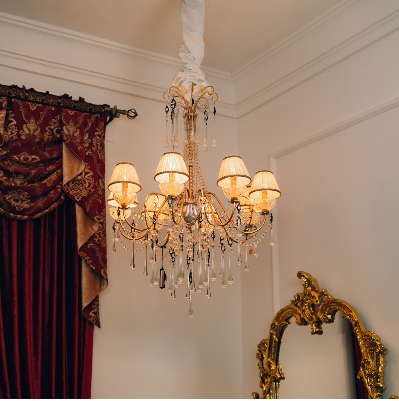 Цагаан өнгийн мурано сарнай, туркоз өнгийн торгон даавуун малгай, тунгалаг туркоз өнгийн мурано дуслаар чимэглэсэн таазны гэрэл